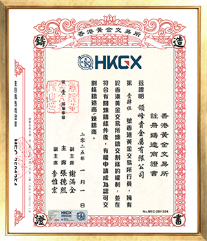 领峰贵金属有限公司2011年于香港注册成立,专营伦敦金及伦敦银的电子交易。 - 香港黄金交易所注册铸造商证书